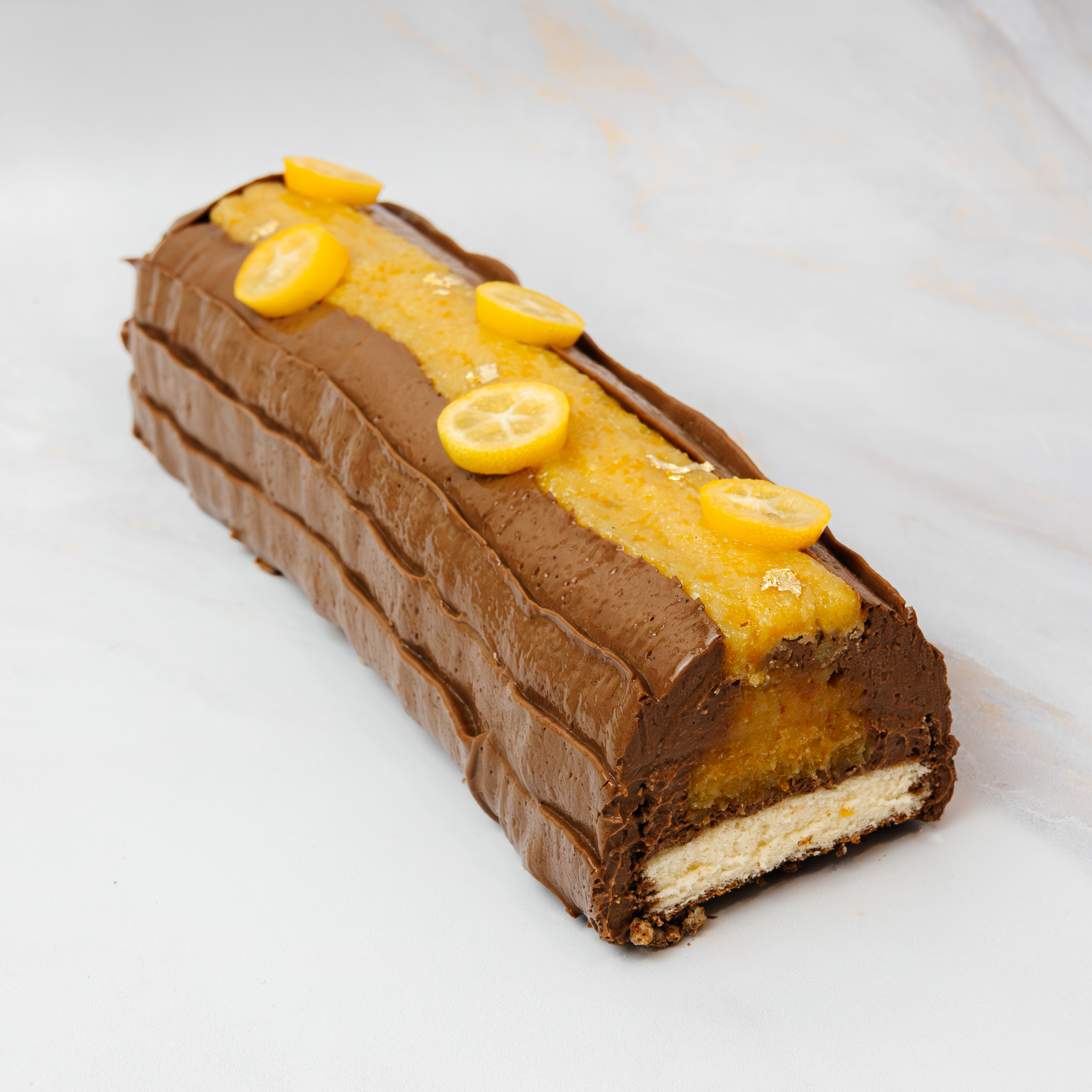 Une bûche sans gluten aux saveurs de Noël, où s'équilibrent le chocolat noir, la chaleur des épices et la marmelade d'agrumes