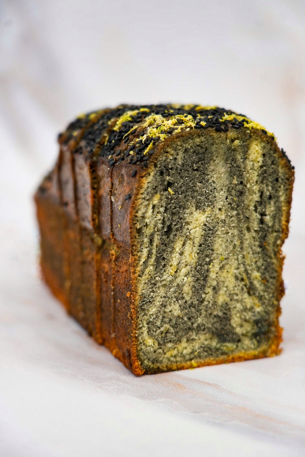Un cake marbré alliant l'acidité du citron et l'intensité du sésame noir