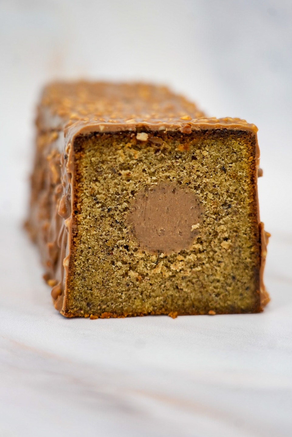 Appareil à cake noisette & hojicha, ganache praliné noisette & hojicha, glaçage rocher